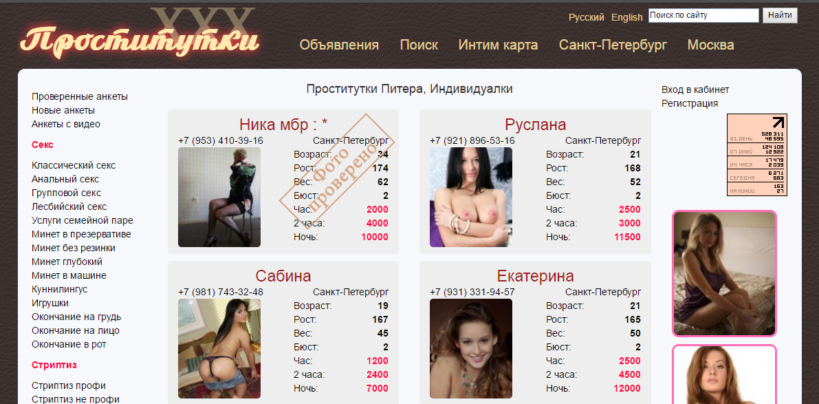 Многие анкеты девушек имеют статус "проверено". Также можно просмотреть достоверную информацию о каждой путане Питера, которая касается возраста, роста, веса, объема груди и размера одежды, а так же указаны фото и телефоны проституток, а так же цены на интим услуги. Если вам необходима встреча с элитной индивидуалкой Питера, то выберите требуемый раздел или используйте поиск.